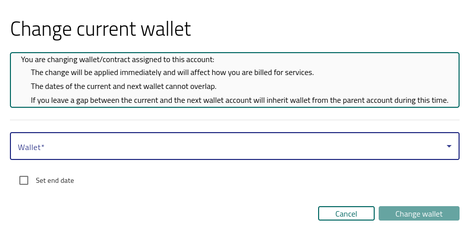 The change of wallet takes effect immediately and affects how you are billed for services.