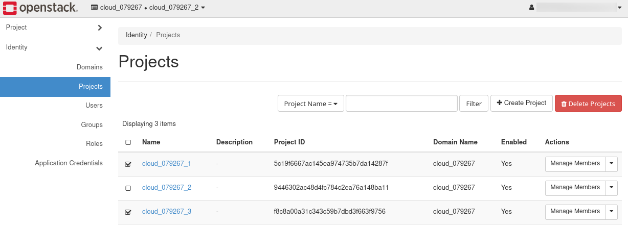 In Horizon, open Identity → Projects from the left menu to list the available projects: