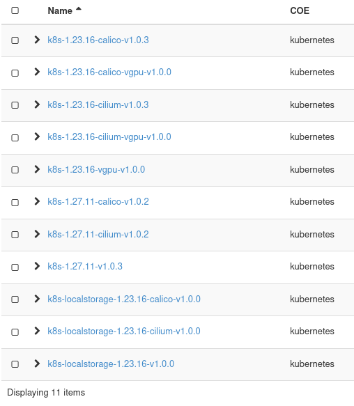 Template availability is volatile. The set of templates, supported Kubernetes versions, and template features (for example provisioning driver, localstorage, cilium, dualstack) can change over time. Always treat the template list shown in Horizon (or returned by the CLI) as the authoritative source.